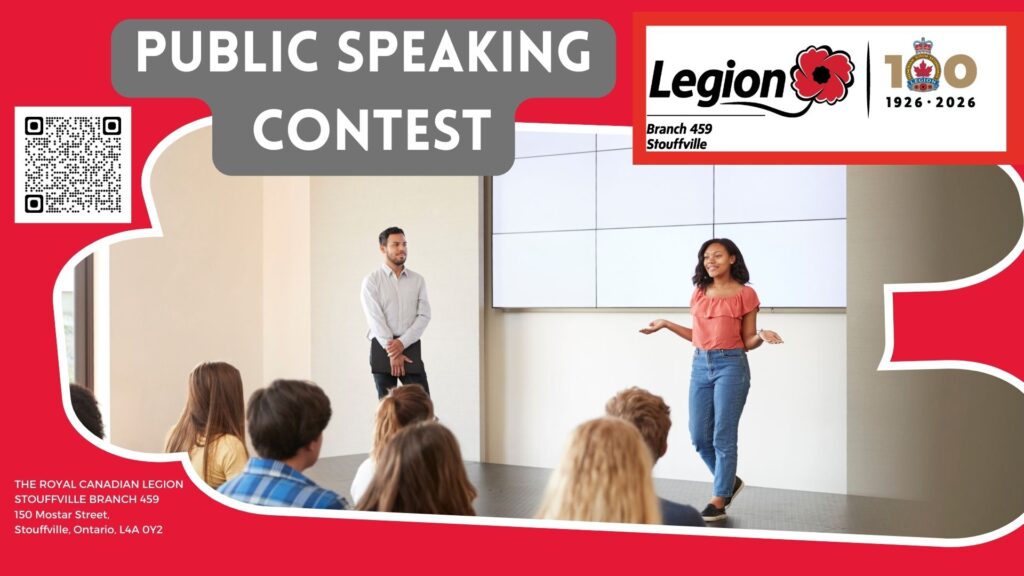 Please visit our website further information and to complete the required pre-registration. (https://www.stouffvillelegion.ca/public-speaking-contest/) Registration will begin at 11am. Each contestant should also bring their original signed entry form to registration.