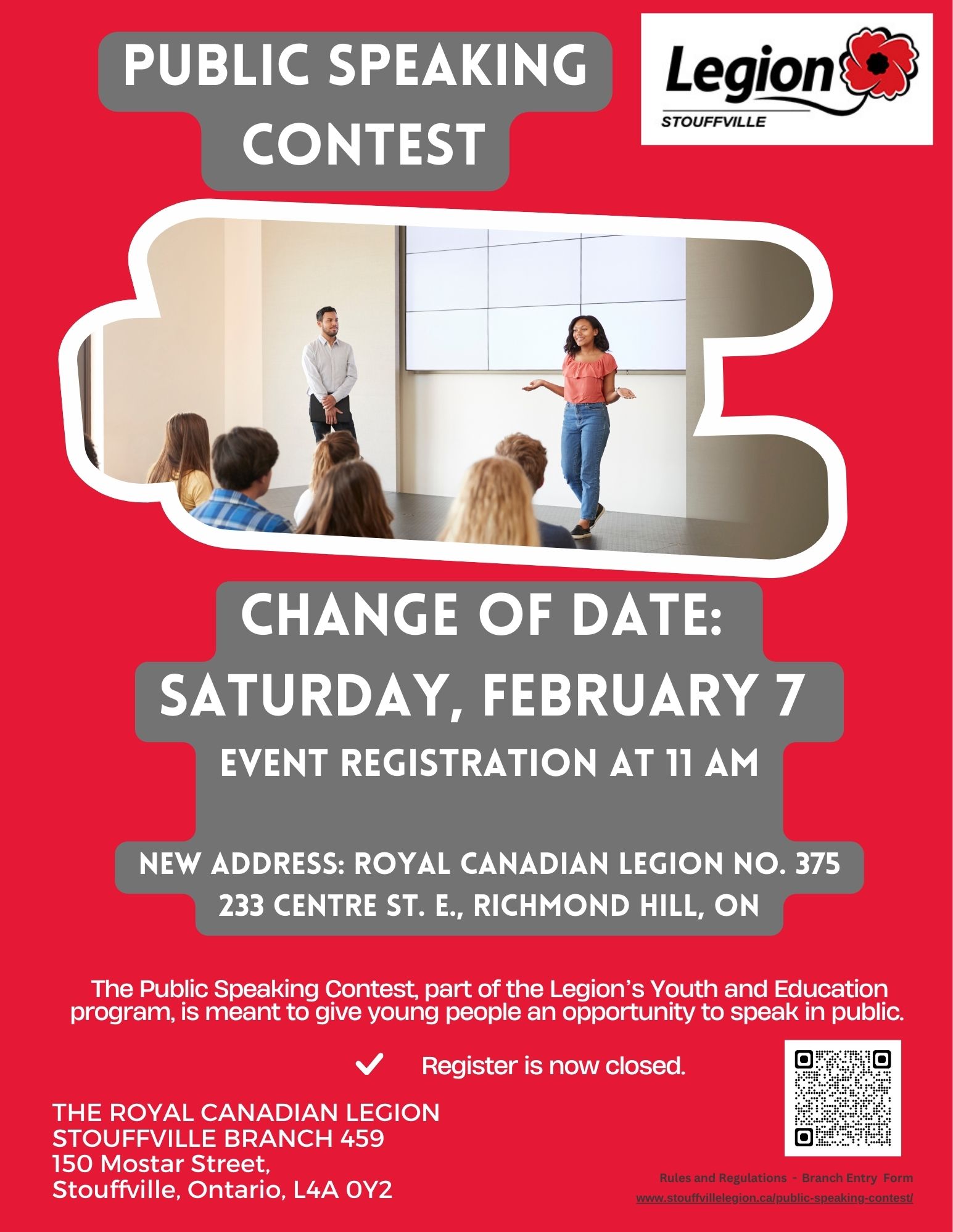 (Stouffville and Markham, Ontario) – The Royal Canadian Legion Branch #459 will be holding our Branch Public Speaking Competition on a new time and place.